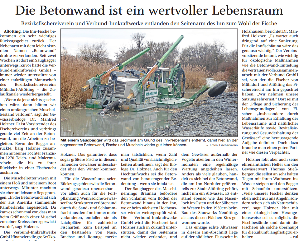 Anbei ein sehr interessanter Presseartikel über die aktuellen Arbeiten am Altwasser Betonwand. Er wurde von unserem Schriftführer Dr. Rudi Neumaier verfasst und letzte Woche im Altneuöttinger Anzeiger veröffentlicht.