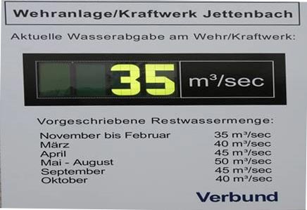 In Inn und Innkanal wird der Wasserstand technisch geregelt: An der Jettenbacher Wehranlage gelten seit dem Jahr 2000 genaue Abflussvereinbarungen zwischen dem Freistaat Bayern und dem Kraftwerksbetreiber Verbund. An der Wehranlage befindet sich eine Anzeigetafel, die die jeweilige Abflussmenge in Kubikmetern anzeigt. Sie regelt auch die Wassermenge, die an den kleinen Inn abgegeben werden muss. Diese ist je nach Jahreszeit gestaffelt, um im Winter eine Trockenlegung und ein Ausfrieren der Kiesbänke zu gewährleisten. Der Innkanal fasst eine Wassermenge von maximal 420 Kubikmetern pro Sekunde. Je nach jahreszeitlich gestaffelter Abgabemenge könnt Ihr anhand des Pegels Wasserburg errechnen, wann zusätzliches Wasser zur Restwassermenge in den kleinen Inn abfließt.